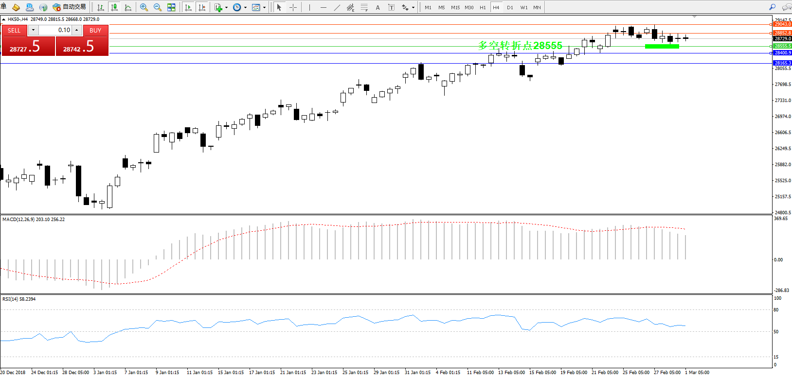 恒指HK50 ——4小时K线图显示: