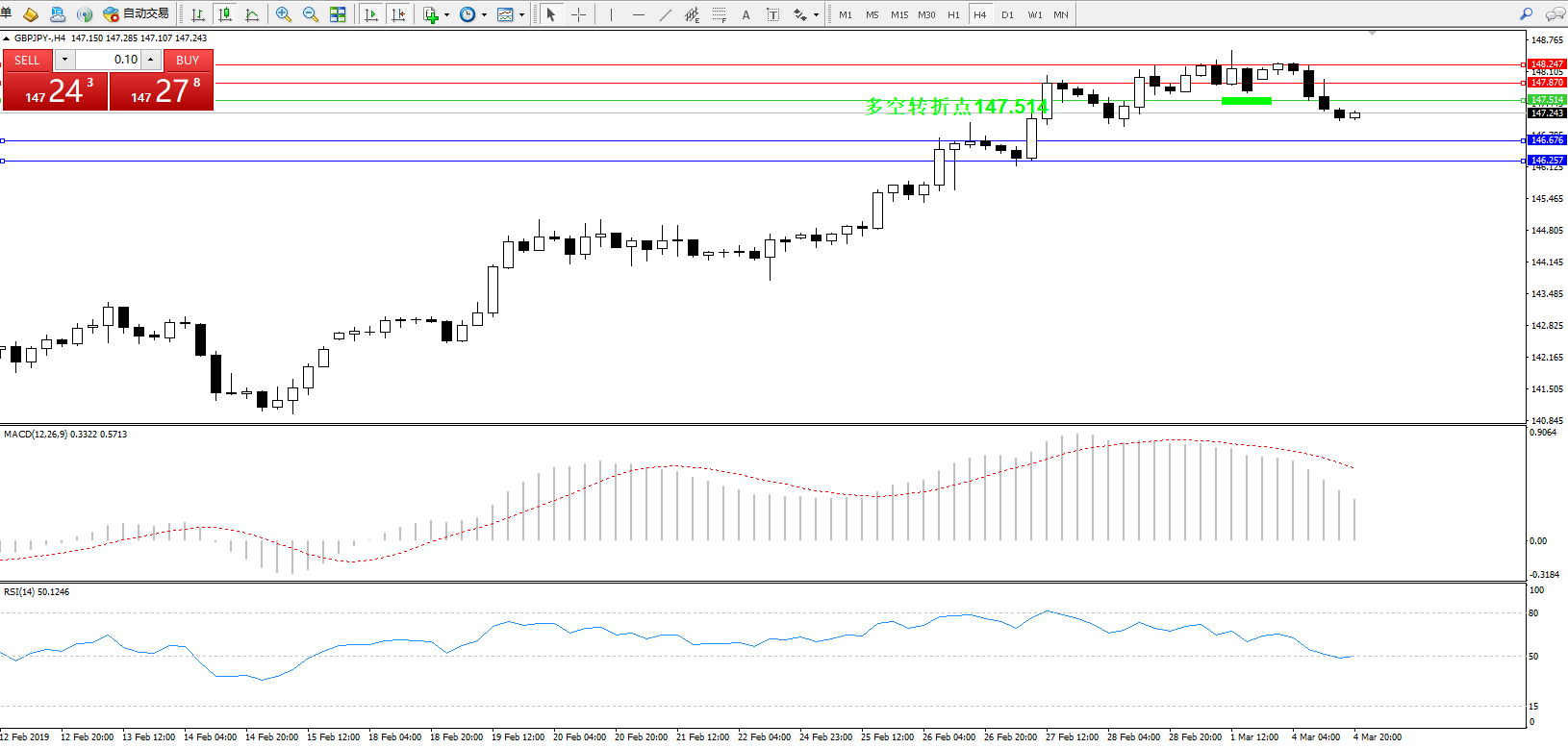 交易策略:147.514下方看跌,目标146.676146.257
