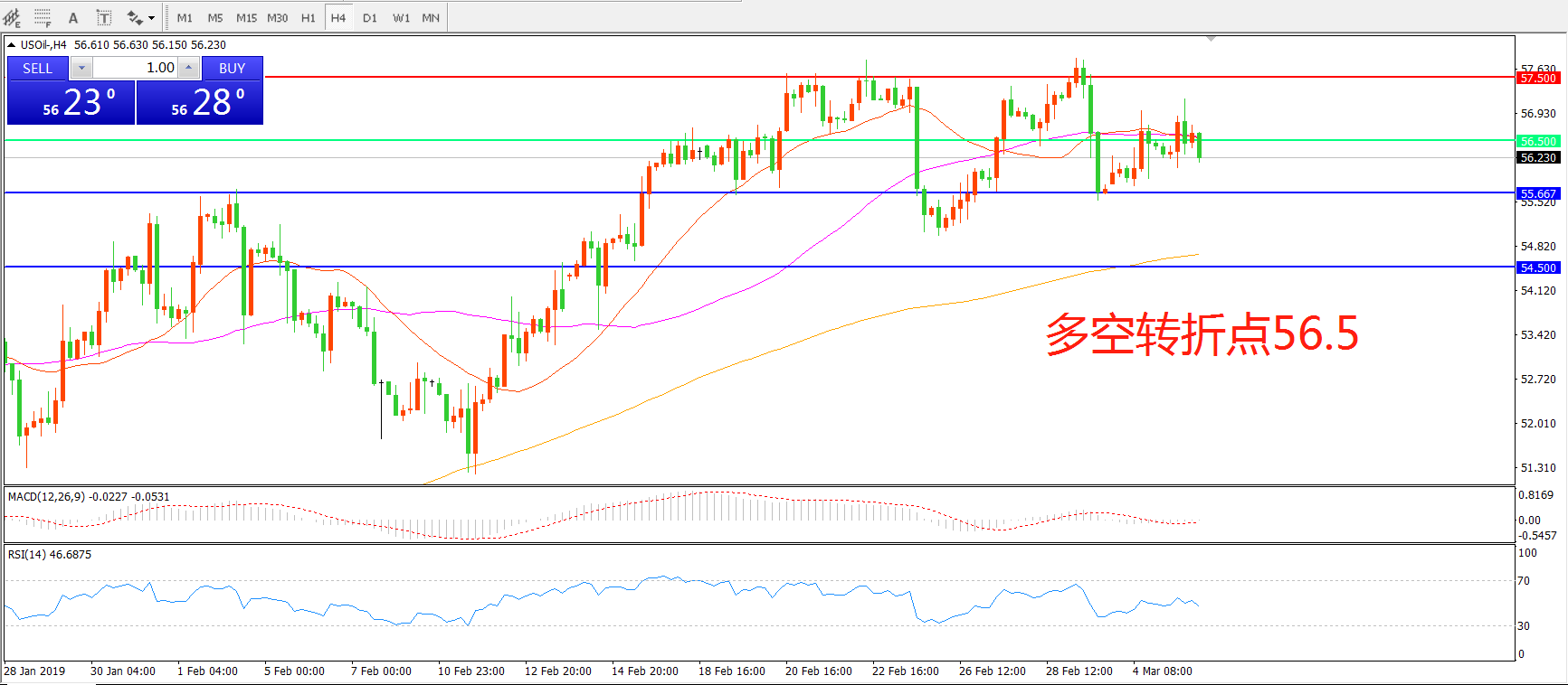 交易策略:在56.50之下看跌,目标55.60   54.50