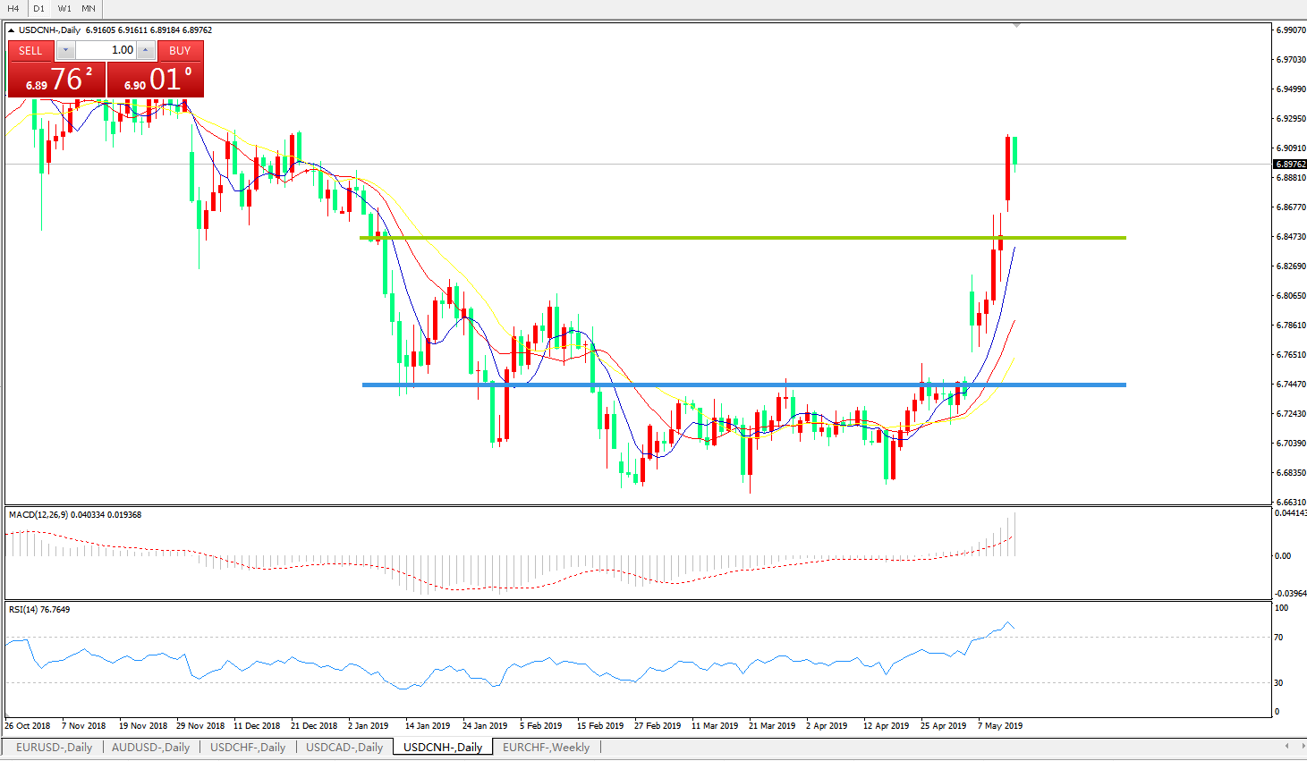 技术面简析:日线均线呈有序多头排列看多,MACD0轴上方运行且动能柱0轴上方快速放量RSI快速走升后小幅回落,汇价企稳多空转折区域维持强力攻势,预计短期汇价有进一步上行空间,重点关注中美贸易争端后续进展