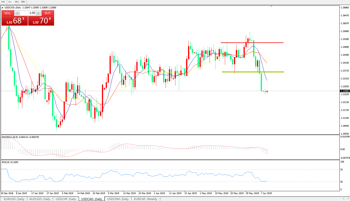 技术面简析:日线图均线呈有序空头排列,汇价大幅下跌后窄幅整理反弹乏力,MACD下穿0轴且动能柱继续放量,RSI走低触及超卖区域,预计汇价大概率将延续弱势继续下行。