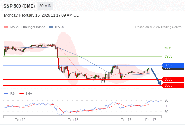 美国标普500指数期货 (H6) 当日内: 短期关键阻力位在6895。