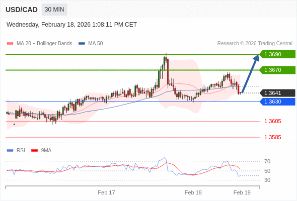 在 1.3630 之上,看涨,目标价位为 1.3670 ,然后为 1.3690 。