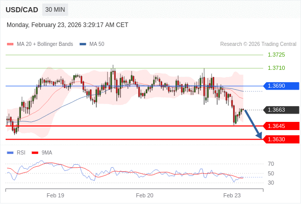 在 1.3690 之下,看跌,目标价位为 1.3645 ,然后为 1.3630 。