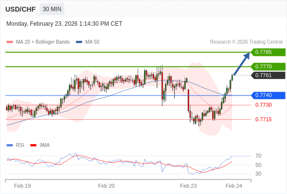 在 0.7740 之上,看涨,目标价位为 0.7770 ,然后为 0.7785 。