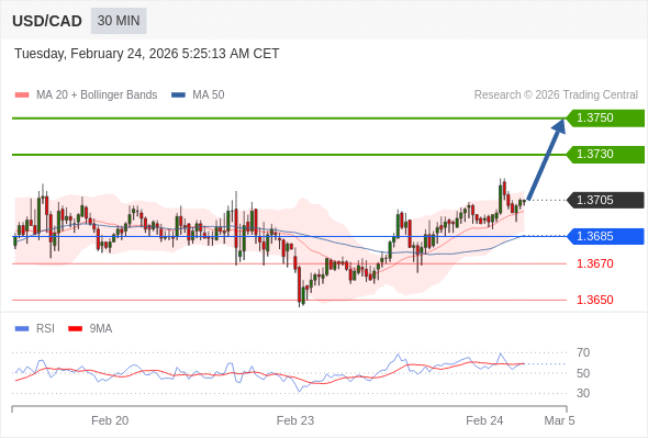 在 1.3685 之上,看涨,目标价位为 1.3730 ,然后为 1.3750 。