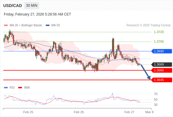在 1.3690 之下,看跌,目标价位为 1.3660 ,然后为 1.3645 。