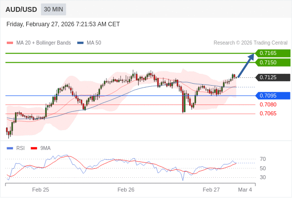 在 0.7095 之上,看涨,目标价位为 0.7150 ,然后为 0.7165 。
