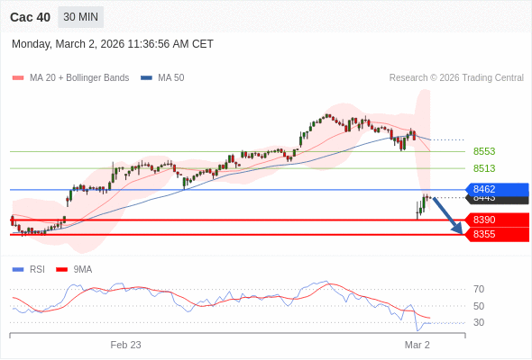 Cac 40 当日内: 短期关键阻力位在8462。