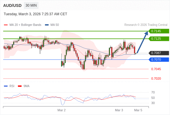 在 0.7070 之上,看涨,目标价位为 0.7125 ,然后为 0.7145 。