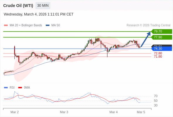 在 74.30 之上,看涨,目标价位为 77.90 ,然后为 79.70 。