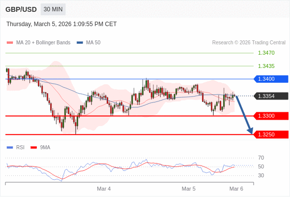交易策略: 在 1.3400 之下,看跌,目标价位为 1.3300 ,然后为 1.3250 。