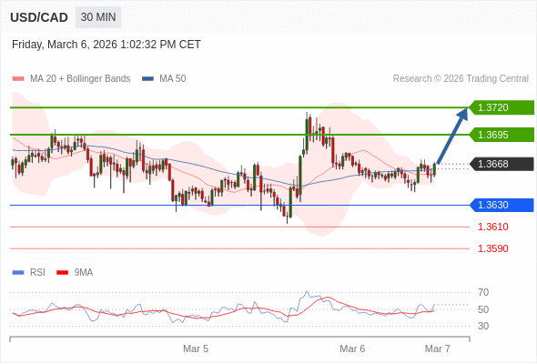 在 1.3630 之上,看涨,目标价位为 1.3695 ,然后为 1.3720 。