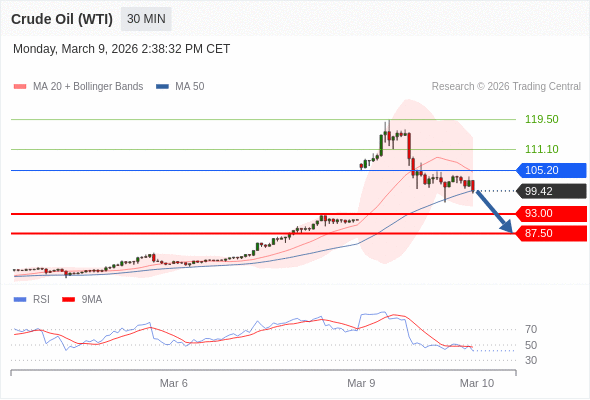 交易策略: 在 105.20 之下,看跌,目标价位为 93.00 ,然后为 87.50 。