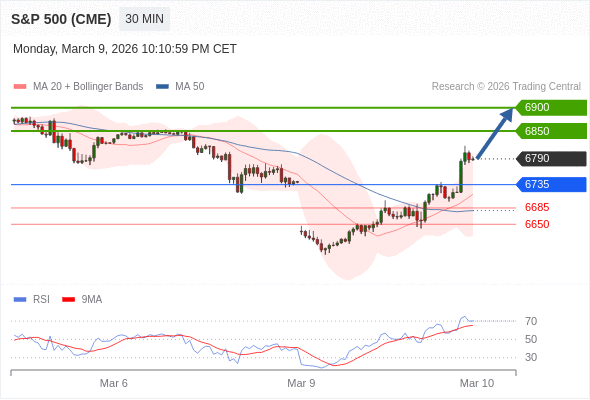 美国标普500指数期货 (H6) 当日内: 目标位为6850。