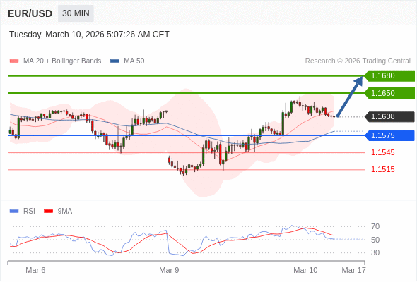 在 1.1575 之上,看涨,目标价位为 1.1650 ,然后为 1.1680 。