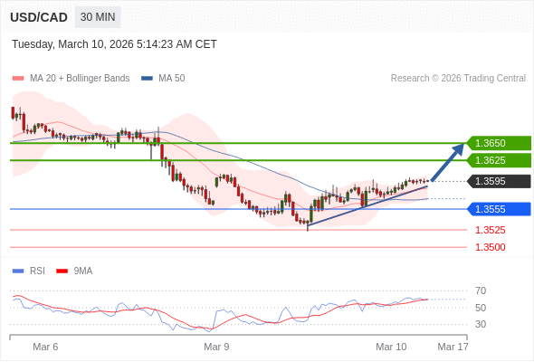 在 1.3555 之上,看涨,目标价位为 1.3625 ,然后为 1.3650 。