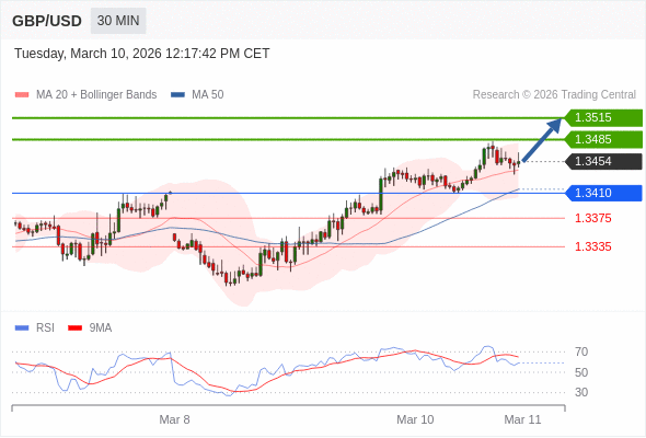 在 1.3410 之上,看涨,目标价位为 1.3485 ,然后为 1.3515 。