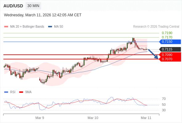 在 0.7150 之下,看跌,目标价位为 0.7090 ,然后为 0.7070 。