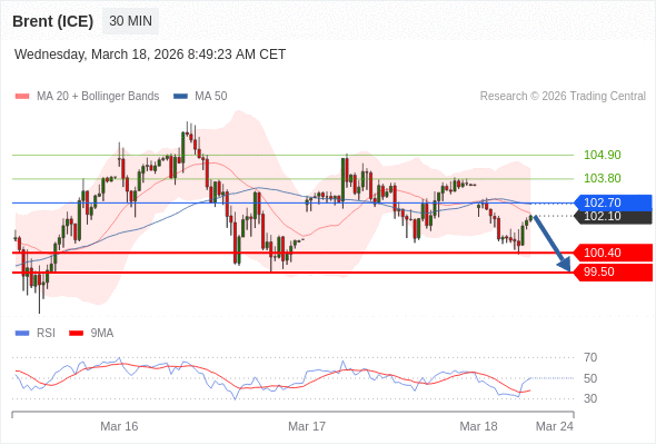 布伦特原油 (ICE) (K6) 当日内: 短期关键阻力位在102.70。