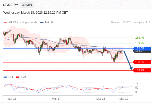 交易策略: 在 159.05 之下,看跌,目标价位为 158.55 ,然后为 158.25 。