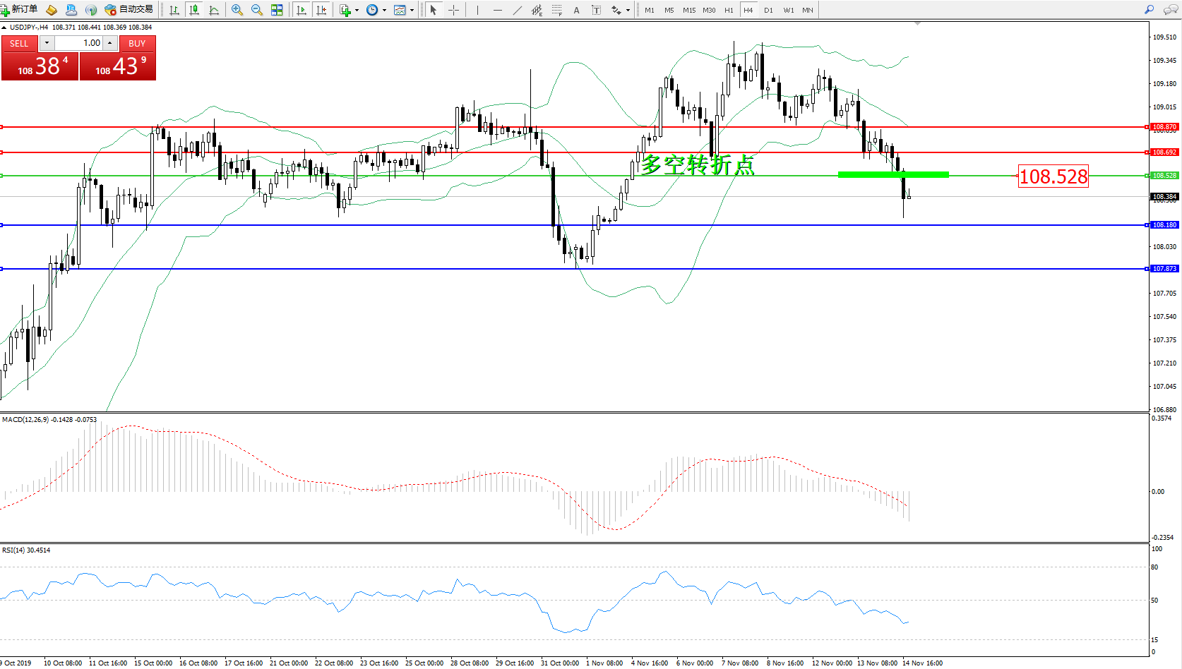 交易策略:108.528下方看跌,目标108.180107.873
