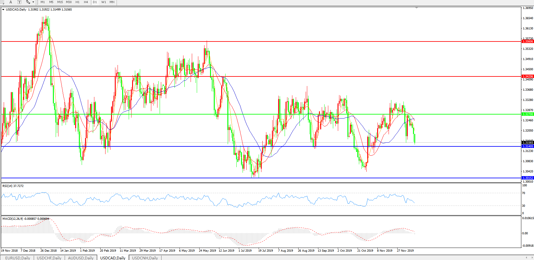 技术面简析:日线图均线再度呈空头排列,汇价继续大幅度下行,MACD在0轴上方持续走弱逼近0轴且量能0轴下方放量,RSI震荡走低,短期汇价需关注1.3140附近支撑,预计汇价存进一步下行空间。
