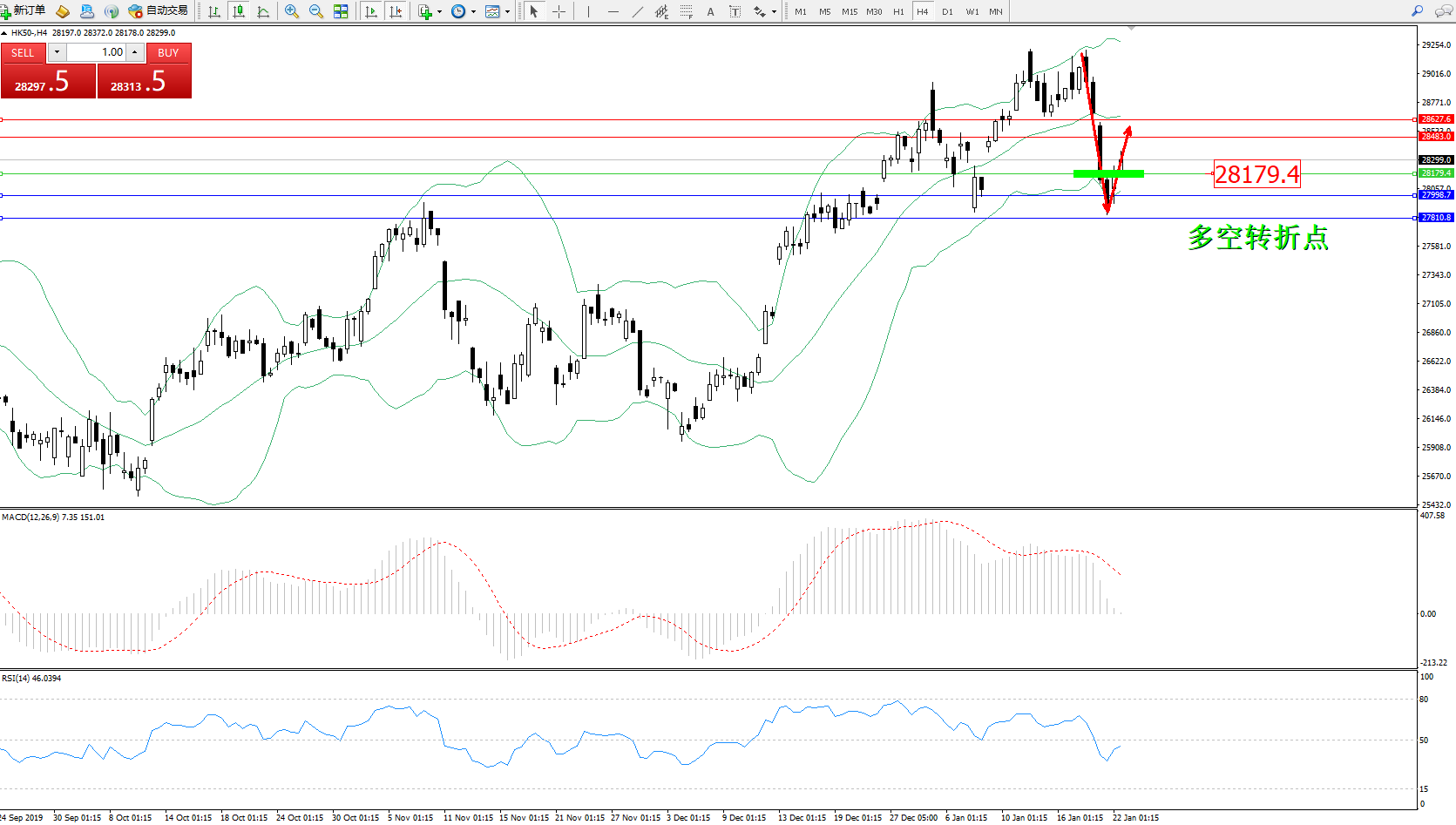 恒指HK50 ——4小时K线图显示: