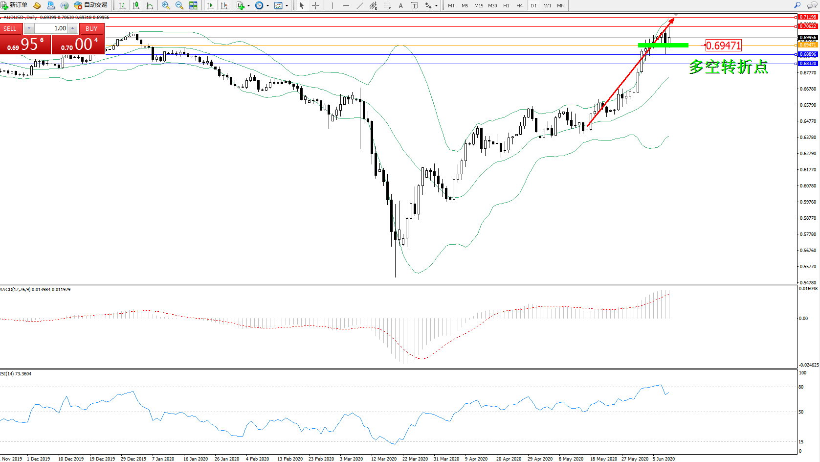 交易策略:0.69471上方看涨,目标0.70622、0.71198