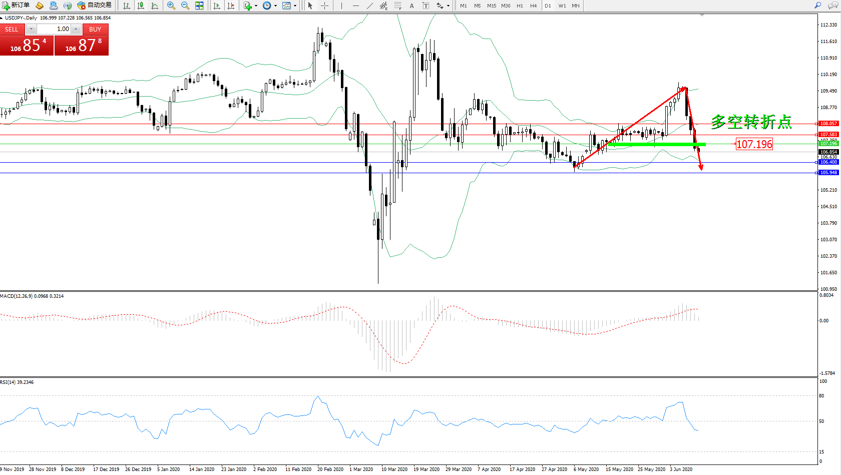 交易策略:107.196下方看跌,目标106.400105.948