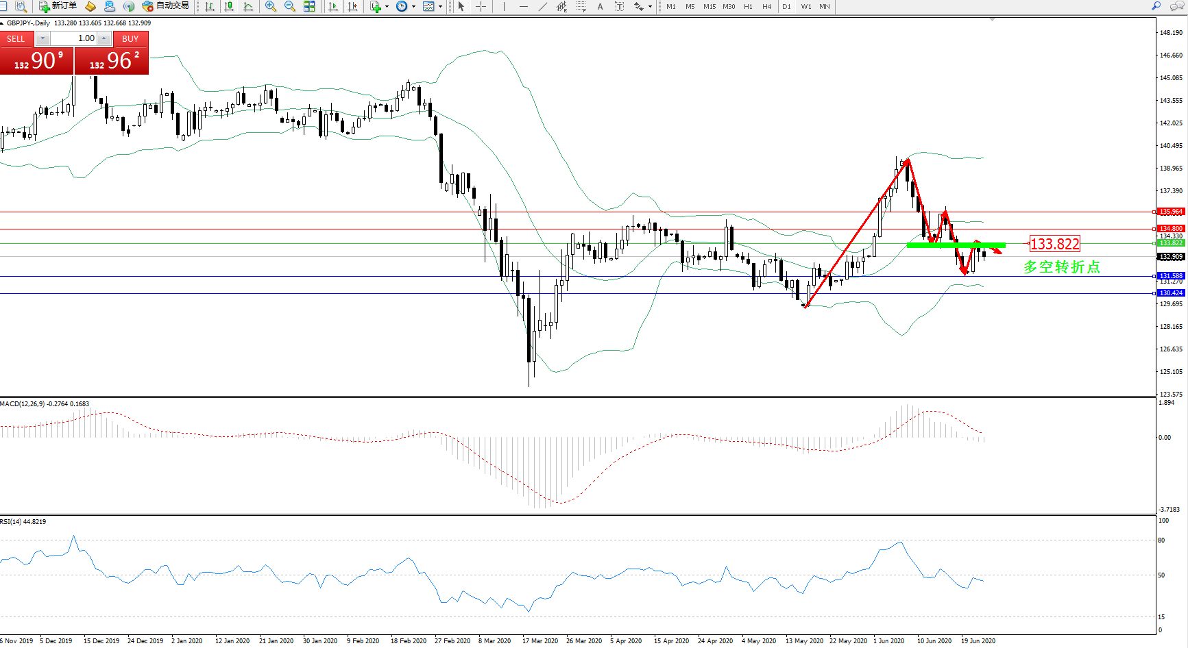 交易策略:133.822下方看跌,目标131.588130.424