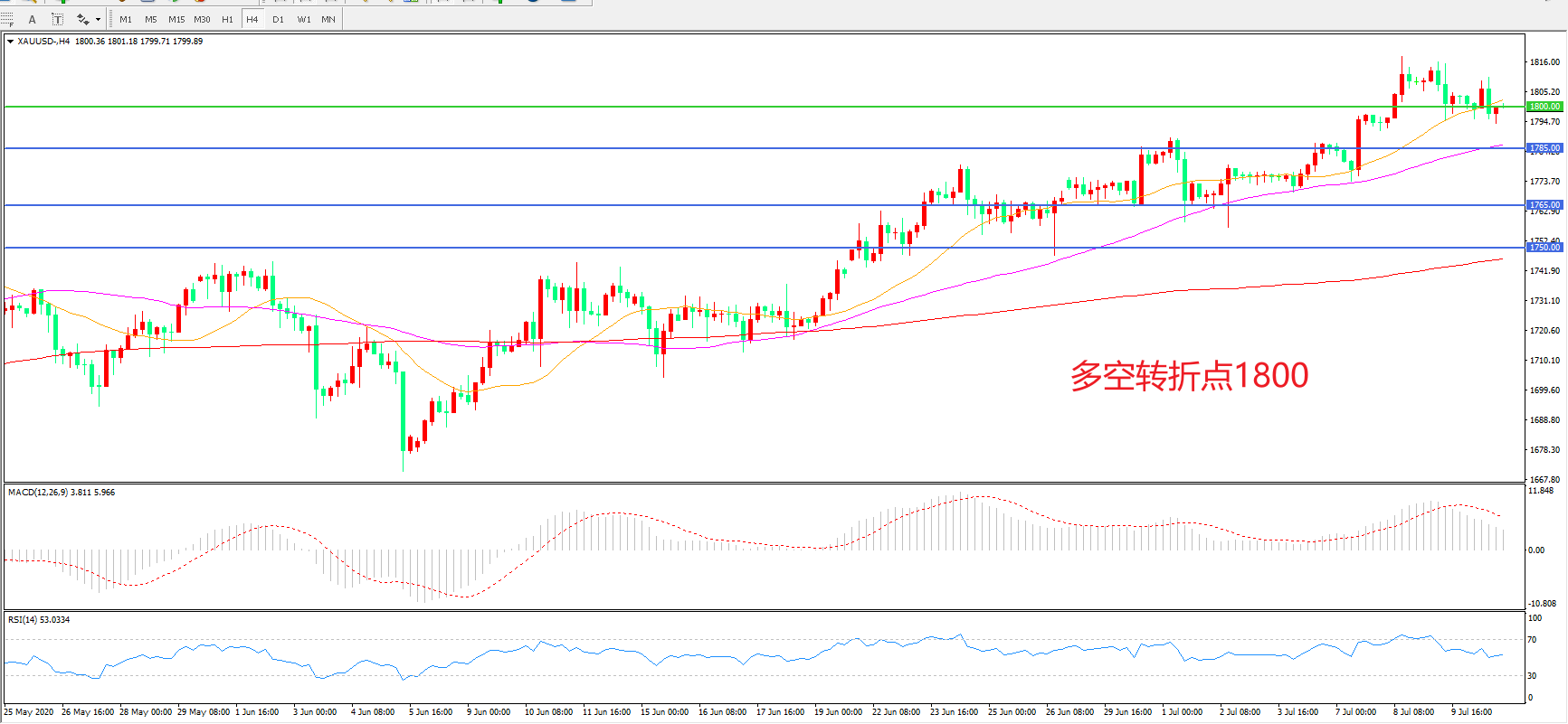 交易策略:在1800.00之上看涨,目标1820.00   1845.00