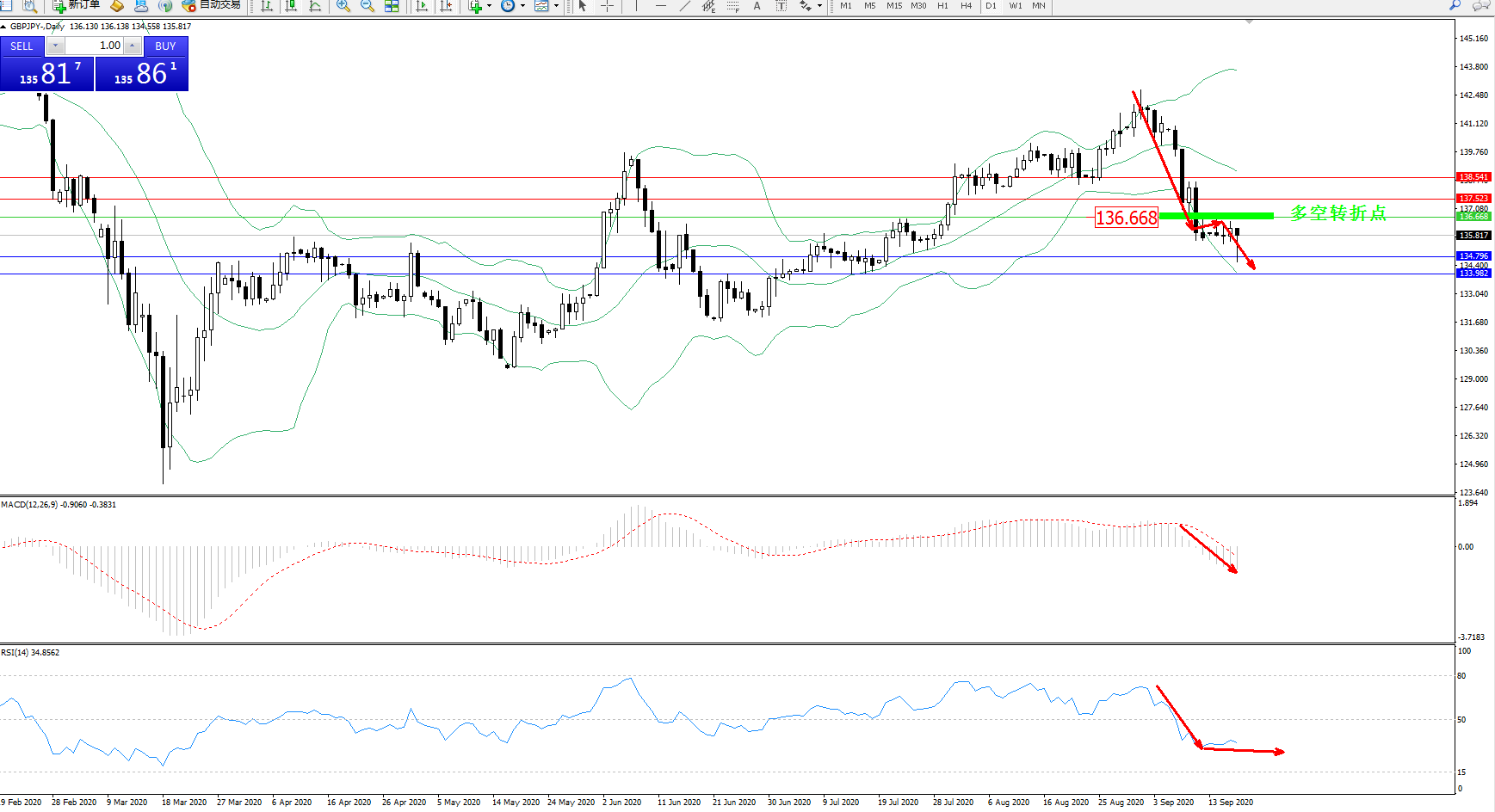 交易策略:136.668下方看跌,目标134.796、133.982