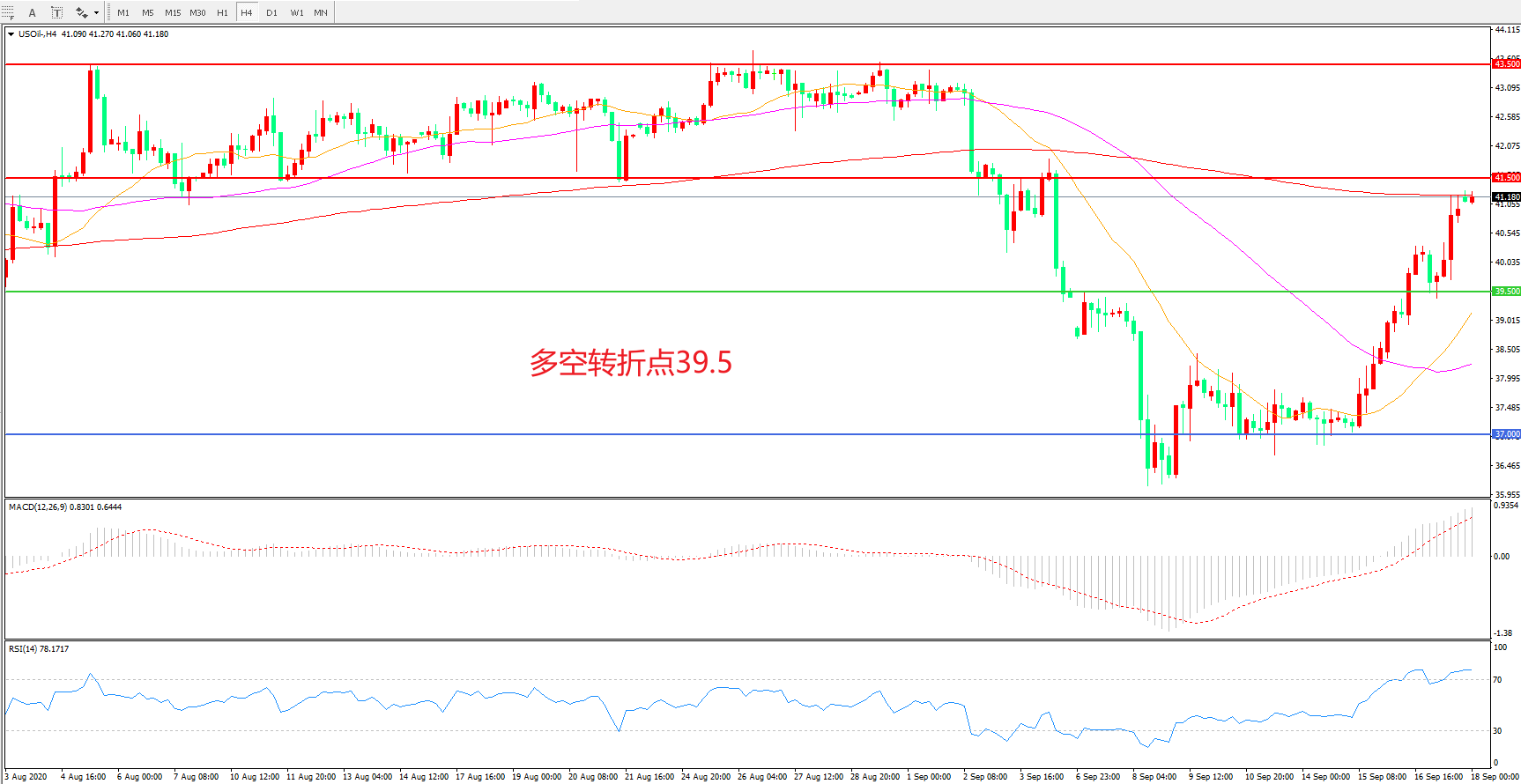 4小时图看,油价盘整后连续拉升,短期表现强势,41.5美元成为短期阻力,均线系统拐头向上,MACD红柱增加,日内延续上行概率较大。