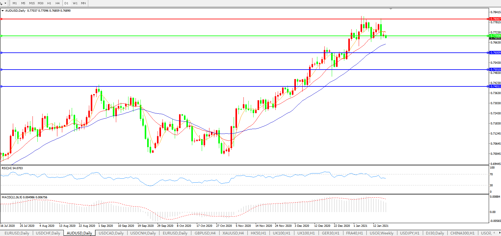 备选策略:0.7700上方看涨,目标0.7800、0.7900
