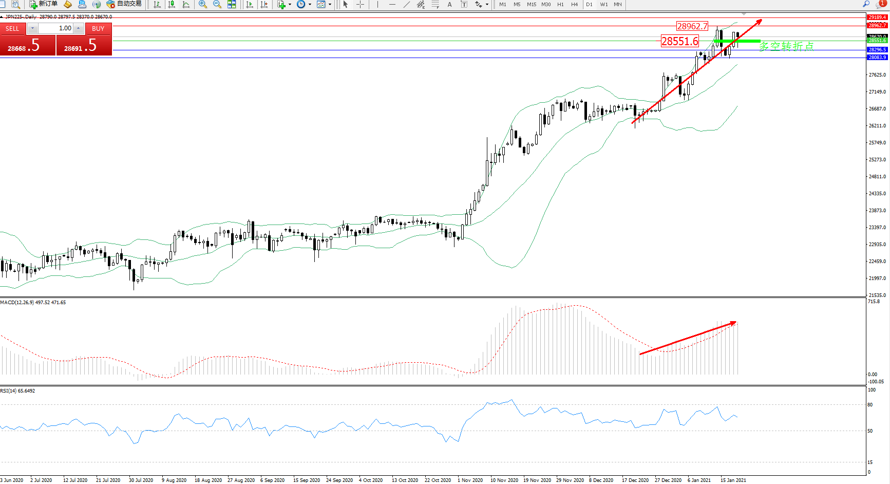 技术点评:多头动力延续布林带指标通道中上轨区间持续震荡上扬态势良好,高位抵达28962位置节点后遇阻出现短暂回撤,然度多头动力未见减弱走势,有继续拉升上扬态势,布林带指标呈收口向上移动走势持续中,MACD指标处于多头区域维持震荡拉升走势中,RSI指标处于50均衡线上方多头区域为吹整理平移中;