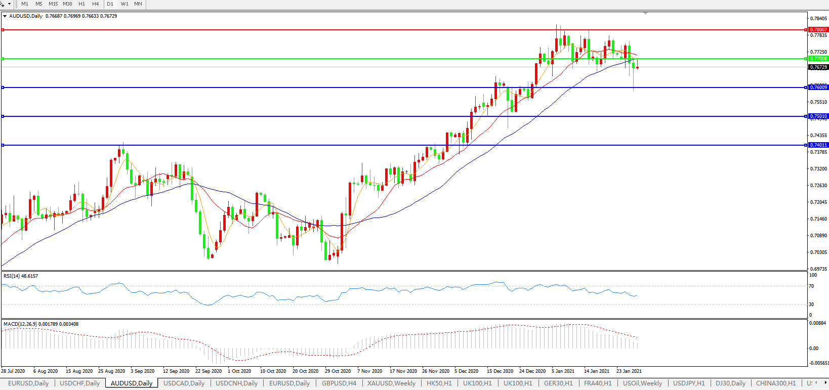 交易策略:0.7700下方看跌,目标0.7600、0.7500