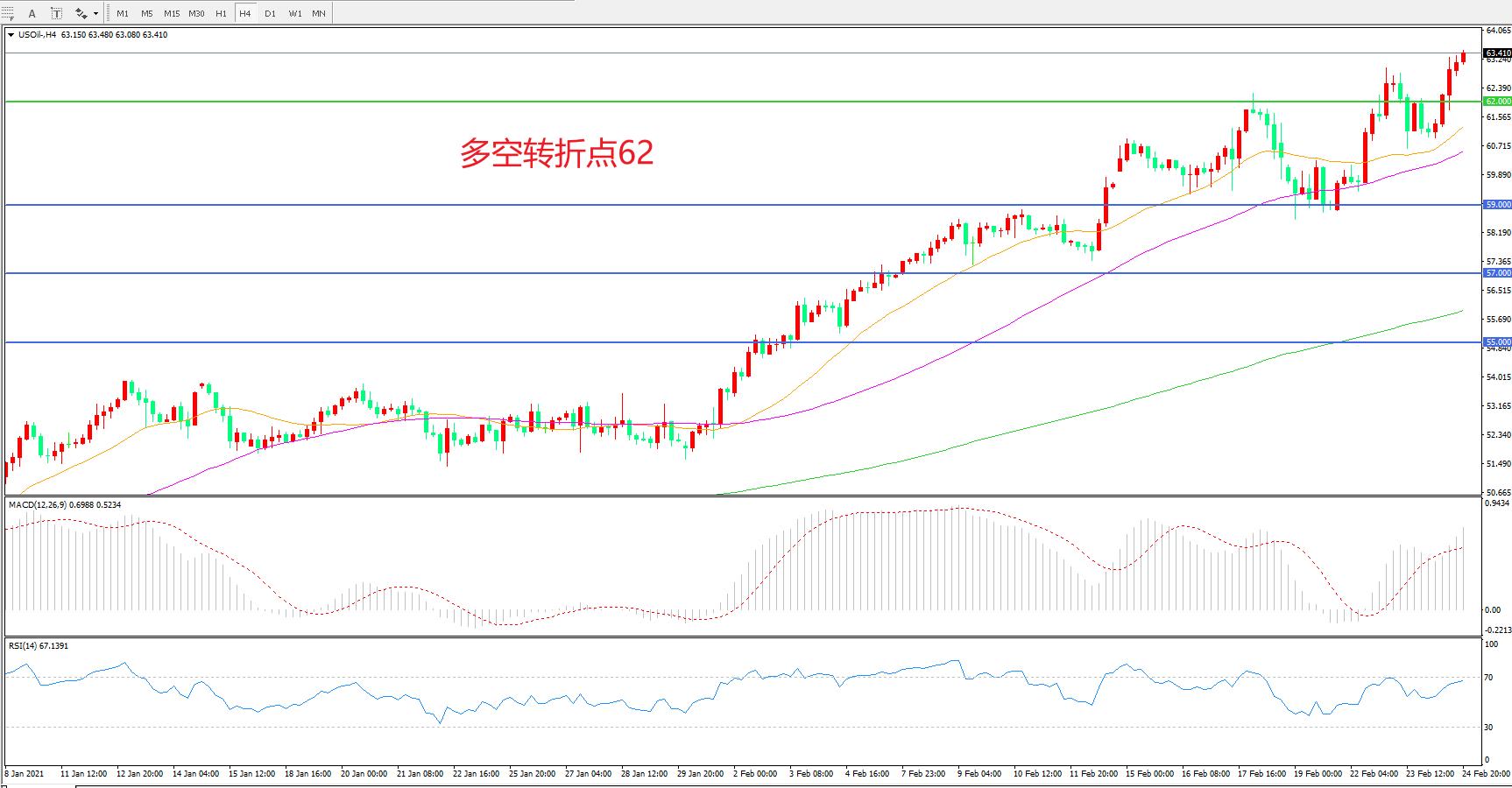 4小时图看,油价小幅回调后再度快速拉升,整体表现十分强势,62美元被顺利突破,均线系统成为下方支撑,MACD红柱增加,RSI指标走平,日内震荡上行概率较大。