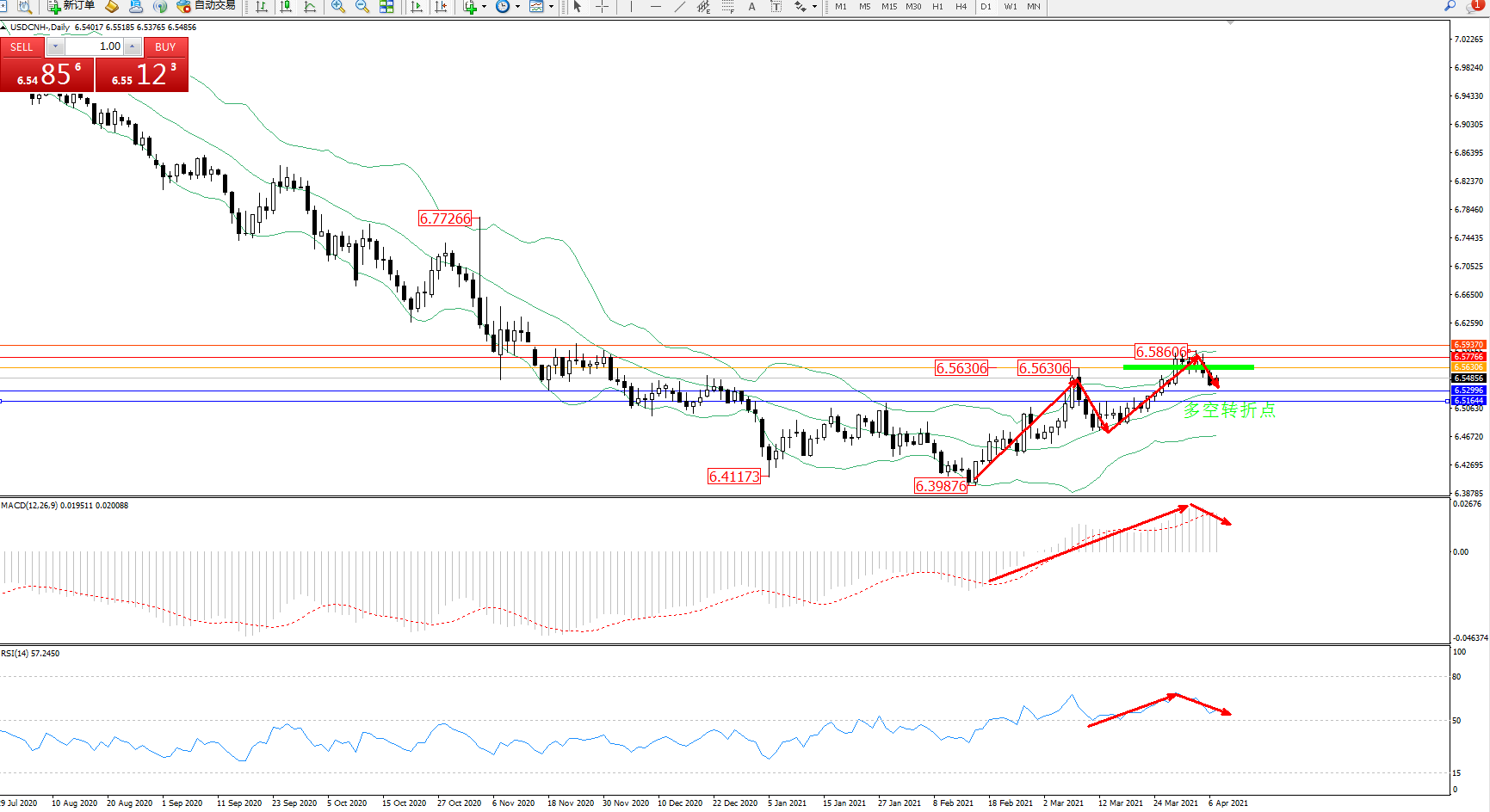 备选策略:6.56306上方看涨,目标6.57766、6.58370