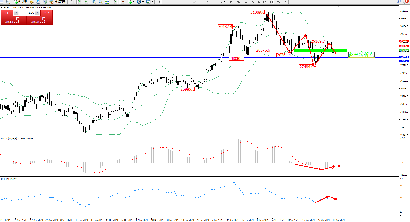 技术点评:空头动力延续布林带指标通道中下轨区间持续震荡下行,低位抵达27484位置节点后得到回升,高位29169位置后遇阻反转下行,触及中轨附近节点后开始持续震荡,布林带指标呈收口走势后开始平移,MACD指标处于0轴线下方空头区域维持整理平移中,RSI指标处于50均衡线附近弱势徘徊后有下移迹象;