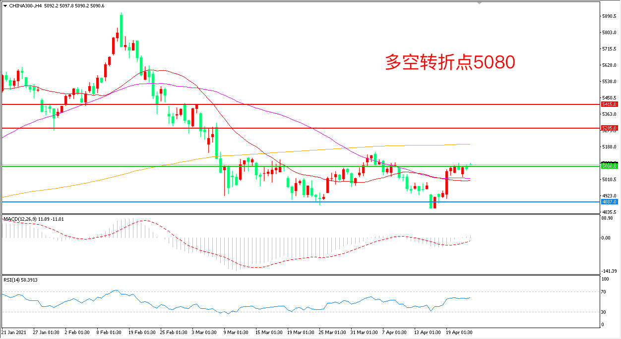 4小时图看,沪深300长阳拉升后延续高位震荡,短期表现依然较强,5080成为多空分水岭,均线系统粘合成为下方支持,MACD红柱增加,RSI指标走平,日内如能再度突破,有望开启新一轮上涨行情。