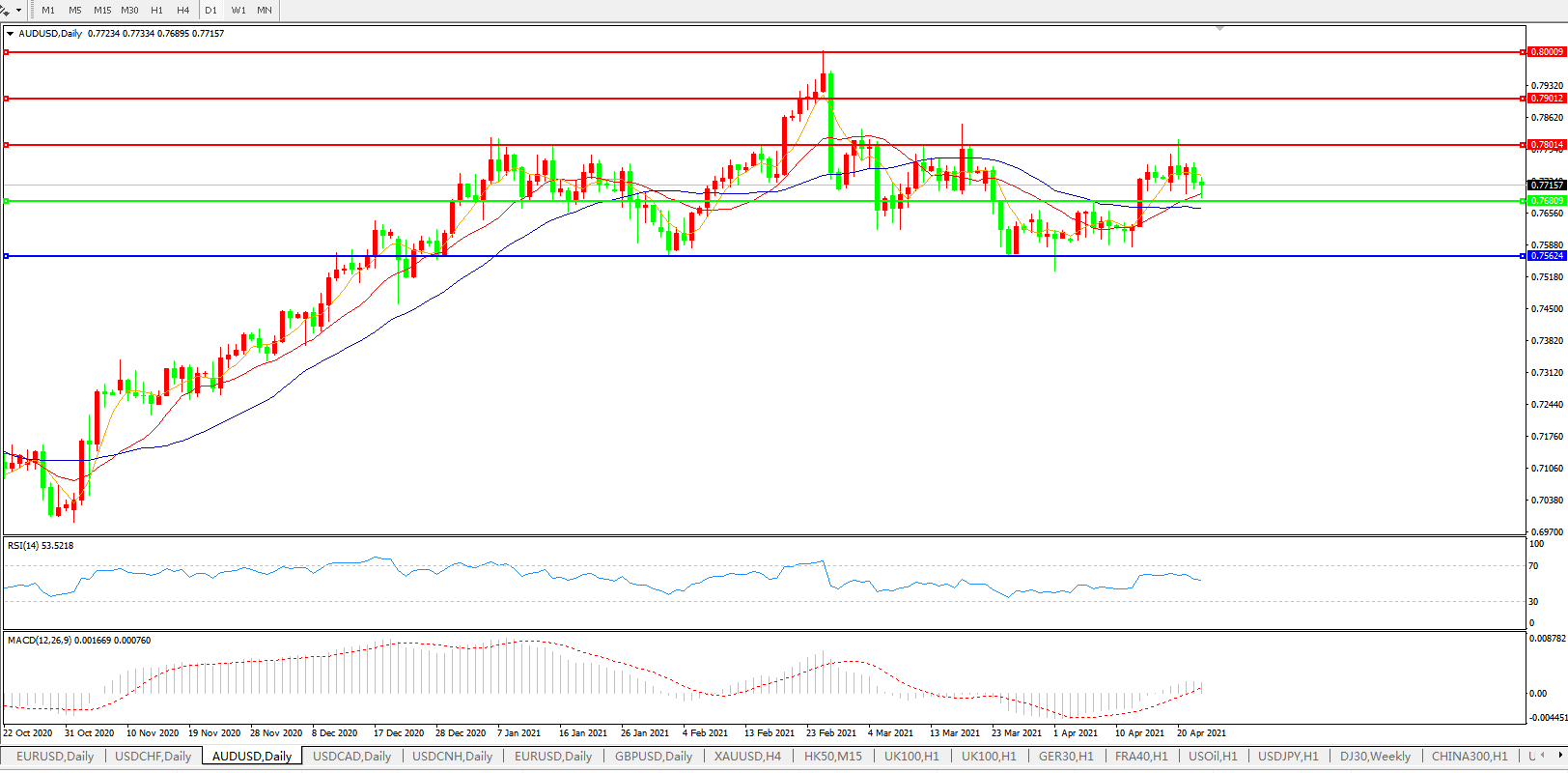 交易策略:0.7680上方看涨,目标0.7800、0.7900