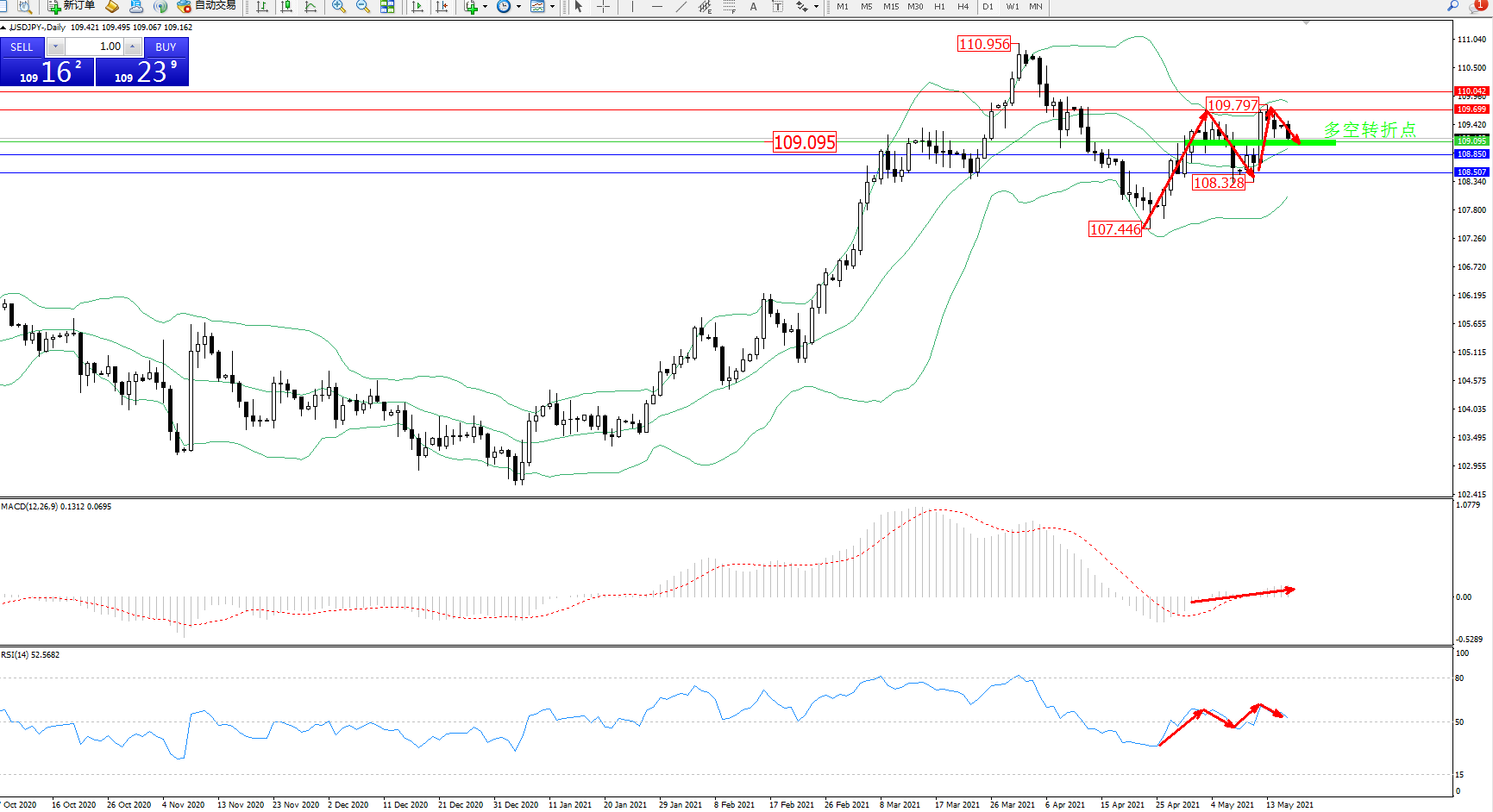 技术点评:低位多头动力持续震荡上扬,高位抵达布林带指标上轨附近109.797节点后遇阻回撤,中上轨区间持续调整中,关注中轨附近节点,布林带指标呈缓慢收口走势平移后有继续徘徊迹象,MACD指标处于0轴线上方弱势徘徊中,RSI指标处于50均衡线上方维持窄幅震荡;
