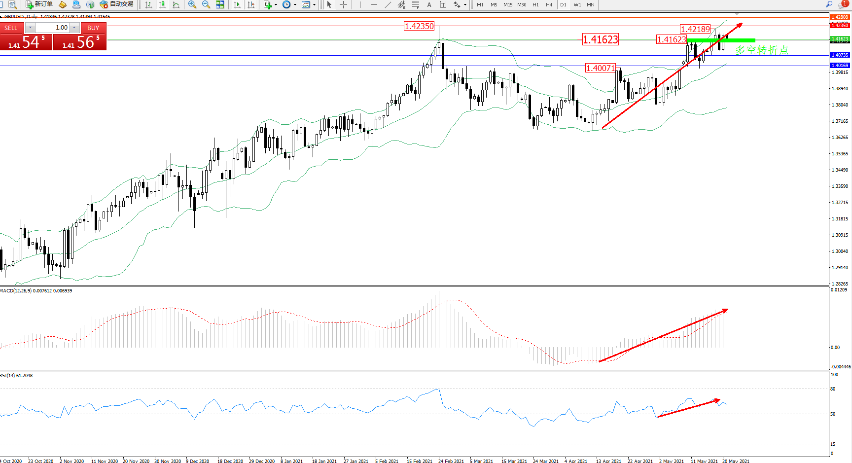 备选策略:1.41623上方看涨,目标1.42350、1.42808