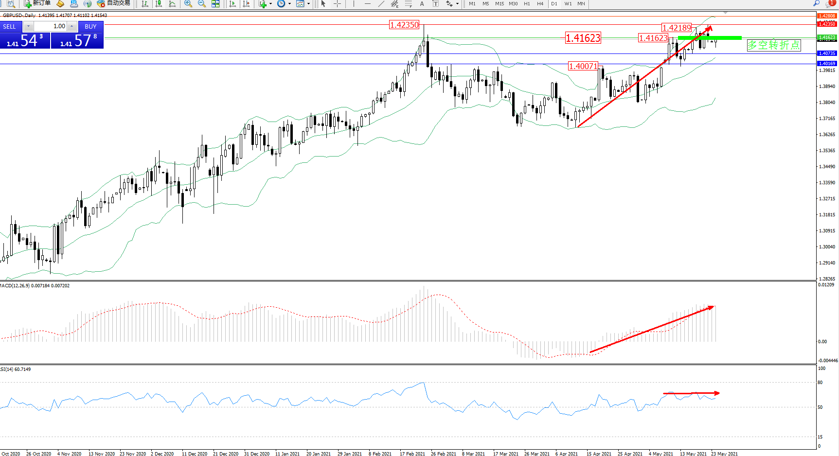 备选策略:1.41623上方看涨,目标1.42350、1.42808