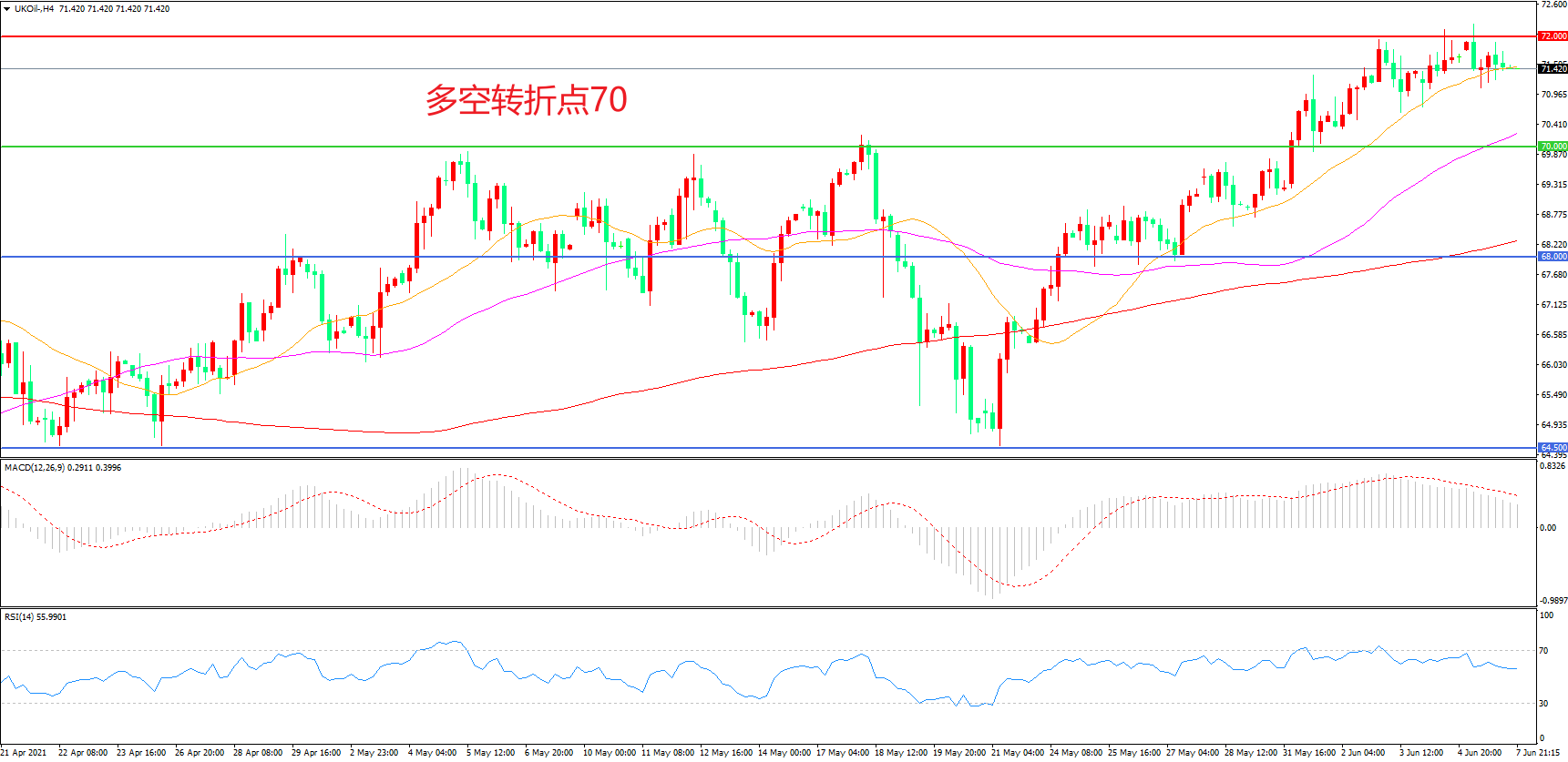 4小时图看,油价延续高位震荡,整体表现偏强,21周期均线成为下方支撑,72美元成为上方阻力,MACD红柱减少,RSI指标走平,日内延续震荡概率较大。