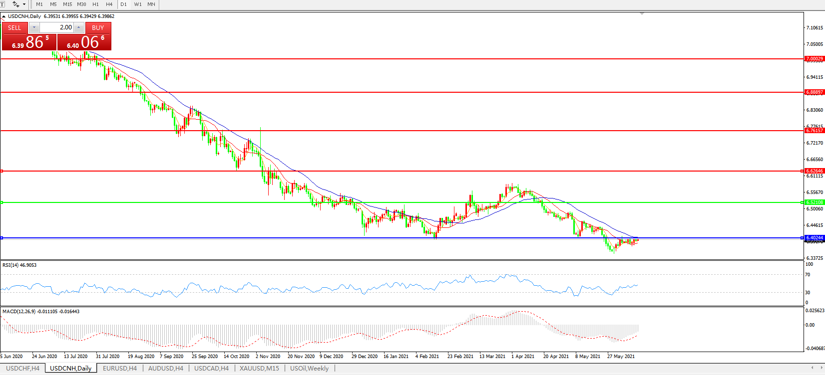 备选策略: 在6.5200之上,看涨,目标价位为6.6270,然后为6.7615。