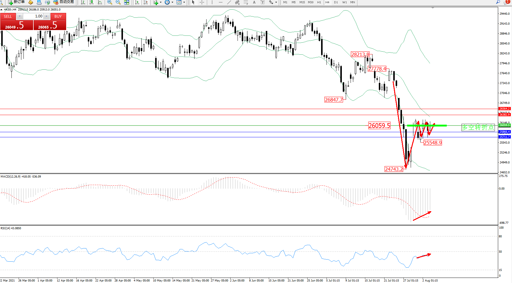 恒指HK50 ——4小时K线图显示: