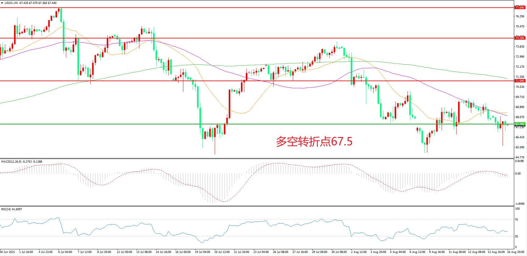 周一(8月16日),在疫情再次蔓延的背景下,投资者已经不再对原油有过高期待,投机性净多头快速撤离导致油价一度快速下挫,OPEC+对不会超量增产的强硬态度缓和了市场中的紧张情绪,美国WTI原油在美盘时段反弹,收报67.50美元/桶。按照目前供应需求的发展趋势,油价未来大概率会有重心振荡下移的趋势。