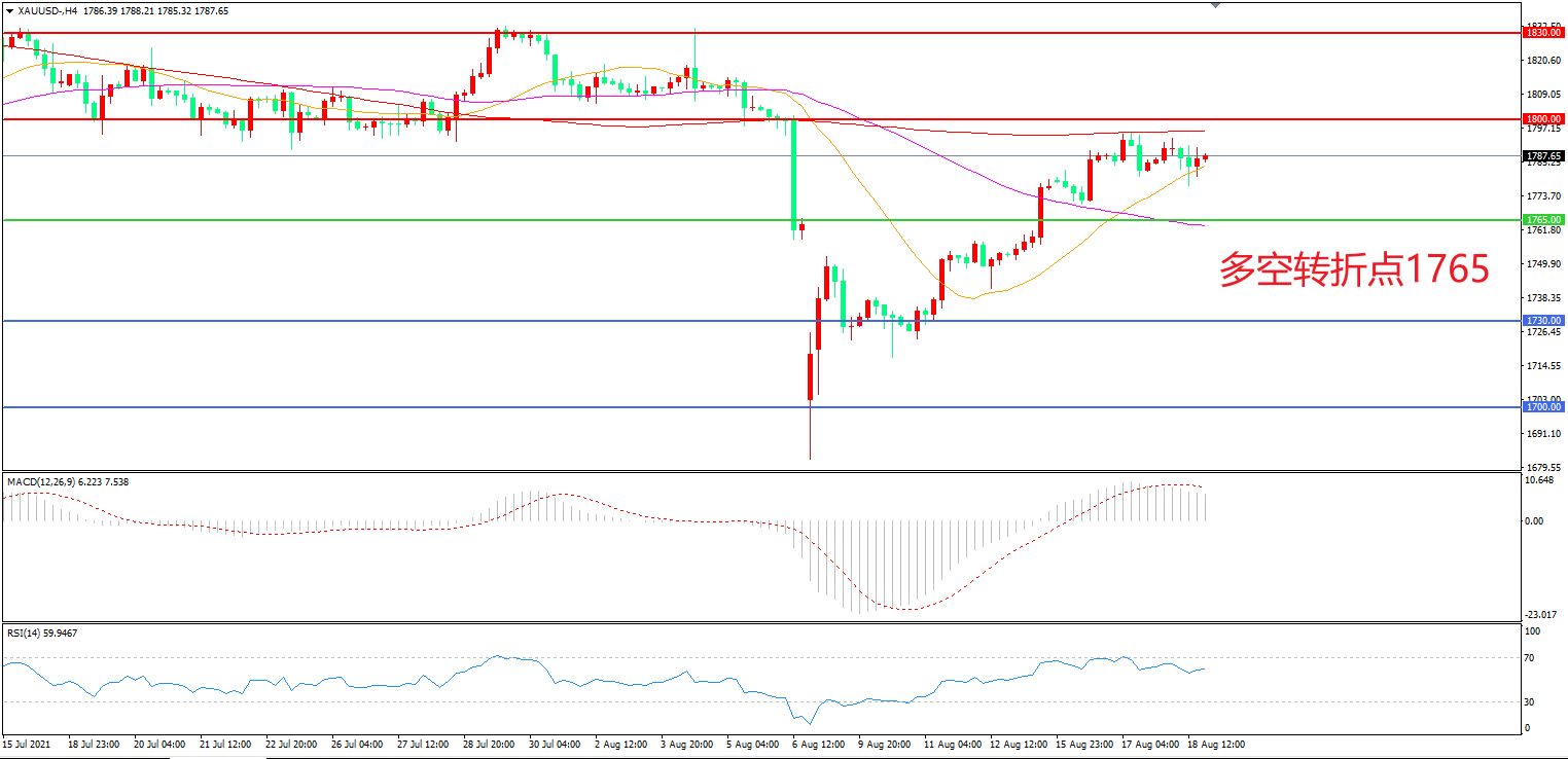 周三(8月18日),虽然没有拿出任何相关决策,但根据最新公布的会议纪要,美联储已经开始讨论缩减QE购债的问题,会议纪要公布后,美元快速回落,现货黄金探底回升,收报1787.30美元/盎司。目前短线金价受制于千八关口,如果近期能够顺利突破,多头有望再次掀起市场波澜。